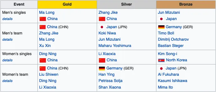 - If you’re looking for the best opportunity to win $2 or $4 off a $100 wager, this is the competition for you. Over the years, China has been simply dominant in this event, winning 28 of a possible 32 gold medals since table tennis was introduced as a full Olympic sport at the 1988 Games in Seoul. South Korea has three golds to its credit, while Sweden (yeah!) has the other.