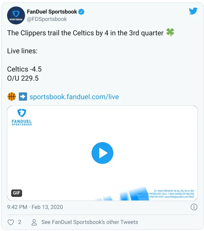 Many of the same options that are available before a game begins are available with live betting. The most popular bets both pregame and with live betting are moneylines, spreads, and totals. Here's an example of a tweet from FanDuel Sportsbook to give you an idea of how live lines are reflected.