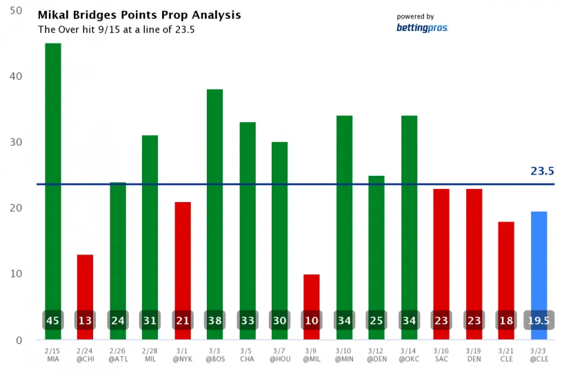 Mikal Bridges has taken over as the leading scorer for the Brooklyn Nets since Kyrie Irving and Kevin Durant left. Bridges struggled to score the last time these two teams played. He went nine of 21 for 18 points. Tonight could be a repeat of the last time these two teams played. That will limit Bridges’ shot quality.