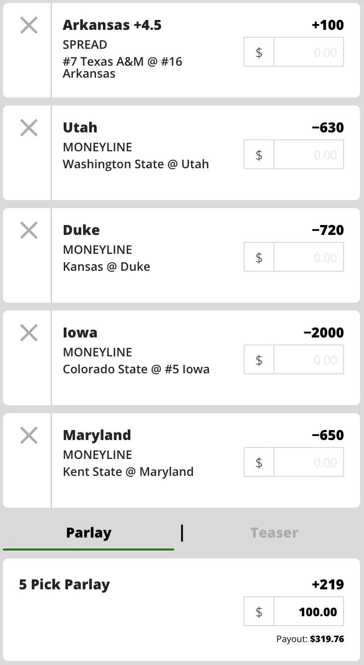This week, we are breaking up our two featured parlays into separate time slots. That way, bettors can enjoy some action during both the afternoon and primetime windows on Saturday. This first parlay features five legs in total. Four of the picks are large moneyline favorites. The fifth play to really help boost the odds has us taking the points with an SEC underdog. Read on for a closer look at each bet in this +219 parlay ticket.