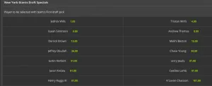 For this prop, bettors are wagering on the player whom the Giants will select with their first pick. Let’s say a bettor wants to wager $100 that New York will select Jedric Wills. To calculate the payout, simply multiply the $100 by the 1.83. Thus, that bettor would be paid $183 (meaning they profited $83). A $100 bet on Tristan Wirfs would result in a $400 payout, and so on.