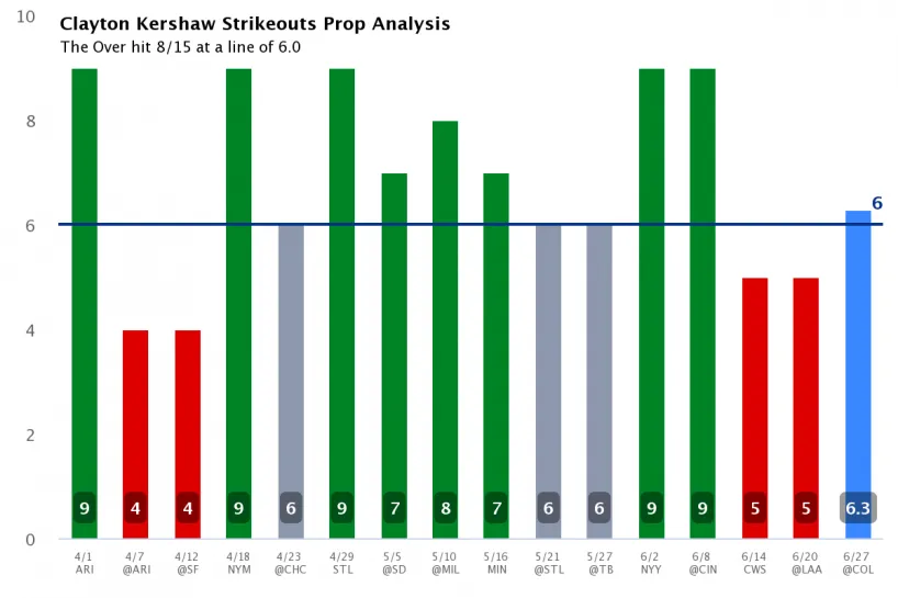 This is the first time Kershaw will face the Rockies this season. They have the sixth-highest strikeout rate in baseball, and they struck out 13 times last night, despite winning. Kershaw has decent numbers against this lineup. He has struck out 27 batters in 98 attempts. That rate wouldn't be enough to get him to six strikeouts, but with how the Rockies have been swinging, he should be above his average tonight.