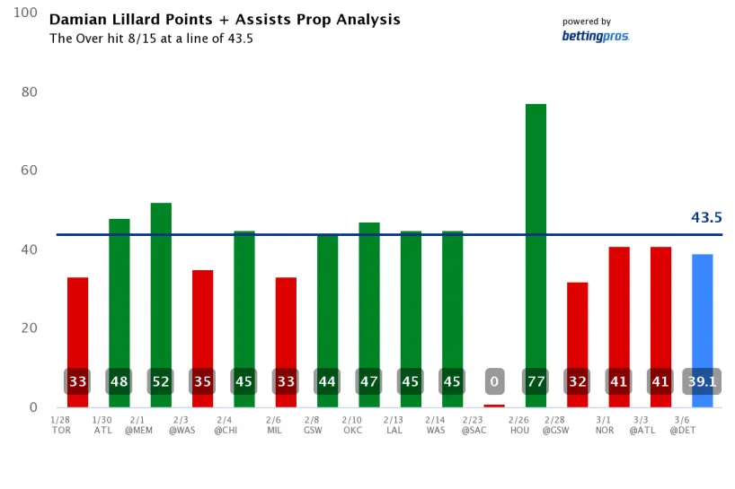 Damian Lillard OVER 43.5 Points/Assists vs. Detroit Pistons (-122)