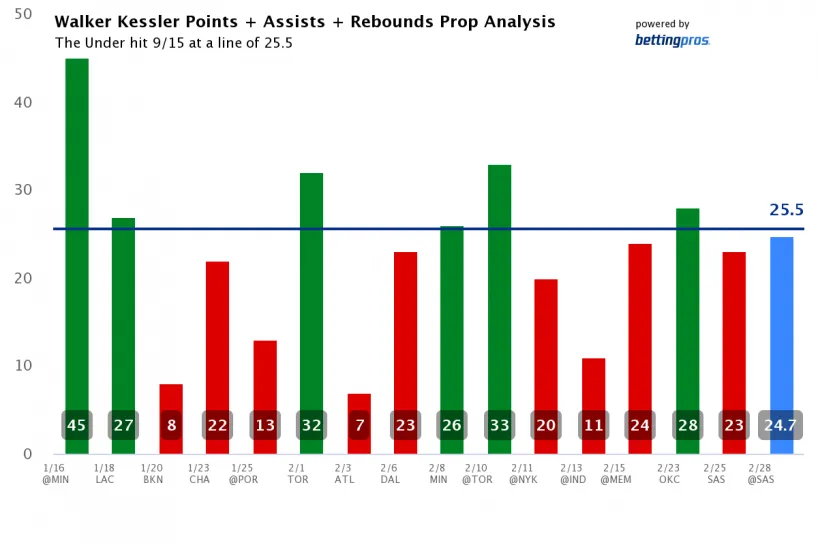 Walker Kessler Under 25 Pts + Ast + Reb (-125 DraftKings)