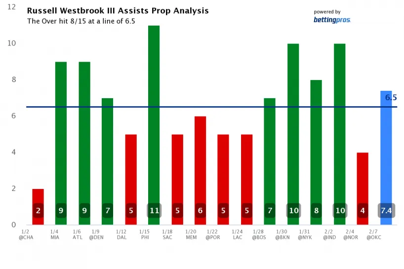 Westbrook has consistently averaged 7.6 assists per game over the last two months, so it's quite surprising that his total is 6.5 in a game like this. Even on the season, it's at 7.5, so reaching seven assists is quite reasonable with his playtime. He's reached at least seven in four of his last five games.