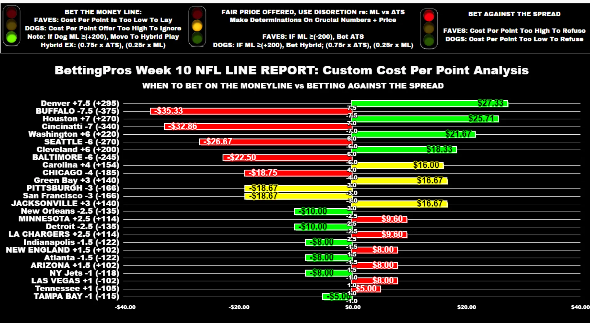 Welcome back to my Week 10 NFL Line Report at BettingPros, featuring my custom cost-per-point betting analysis. If you're unfamiliar with the concept, I encourage you to check out my Week 1 introduction.