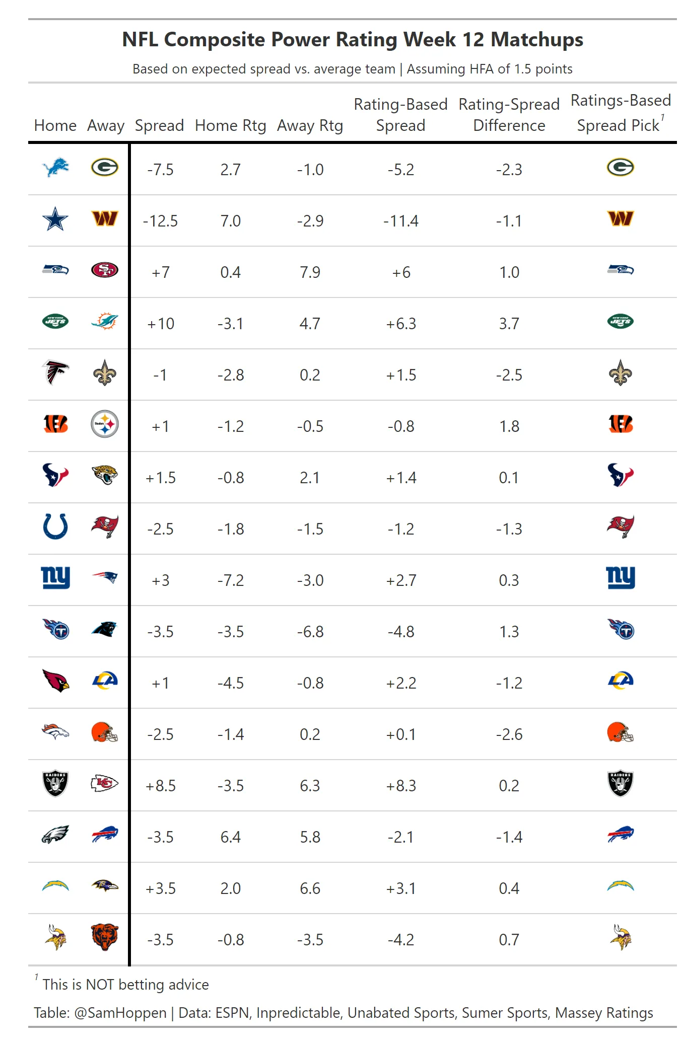 In the second section, I’ve done that while assuming a value of 1.5 points for home-field advantage and using the composite spread from all the sources. Additionally, I’ve provided some comments on trends and numbers that stood out to me.
