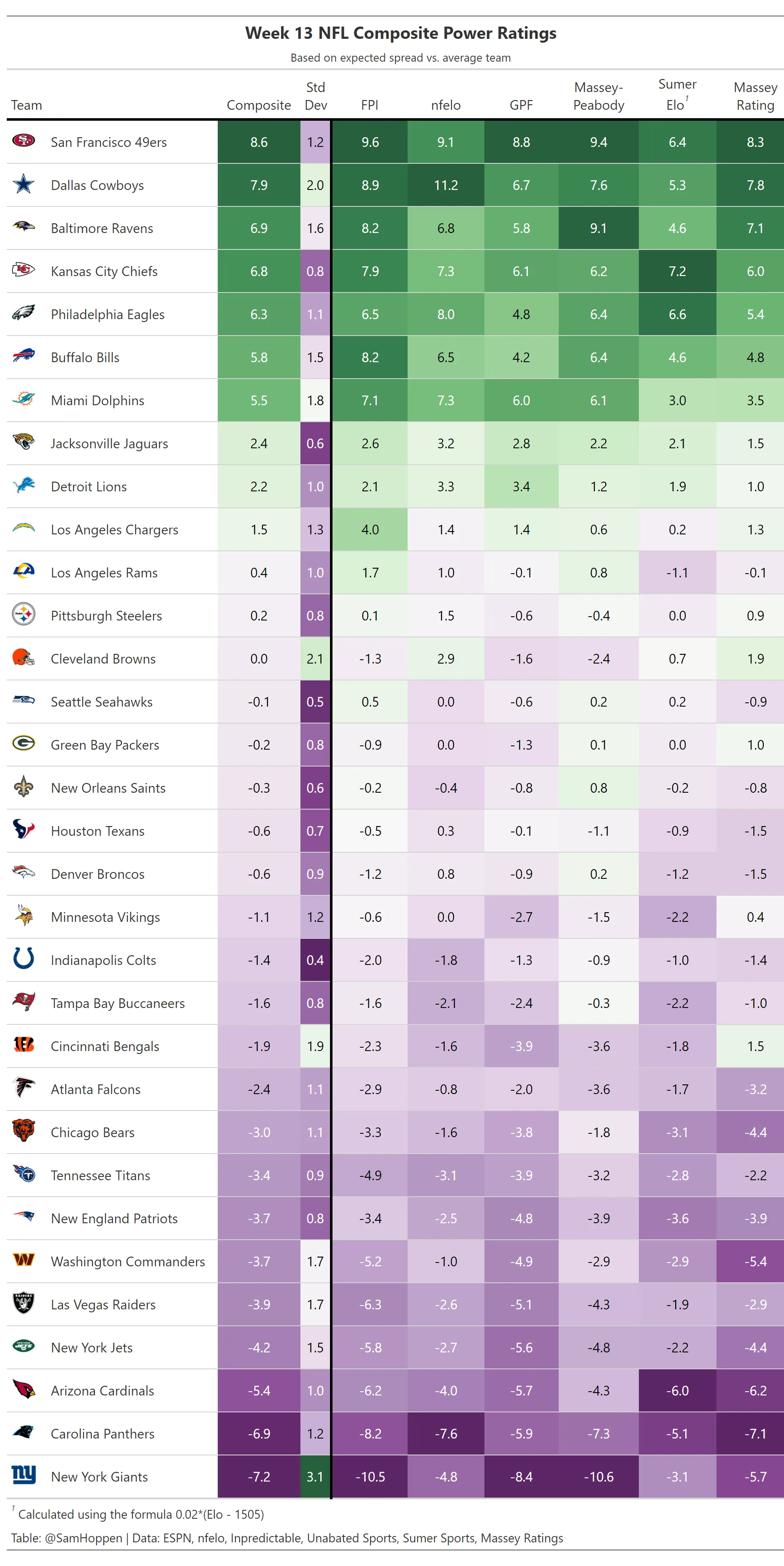 Each week, I compile power ratings from a bevy of respected sources across the NFL handicapping community. Power ratings are designed to identify how many points a team would be favored by against an average team on a neutral field. By calculating the difference in ratings between the two teams (and adjusting for home-field advantage), you can get a ratings-implied spread to compare to the actual spread.