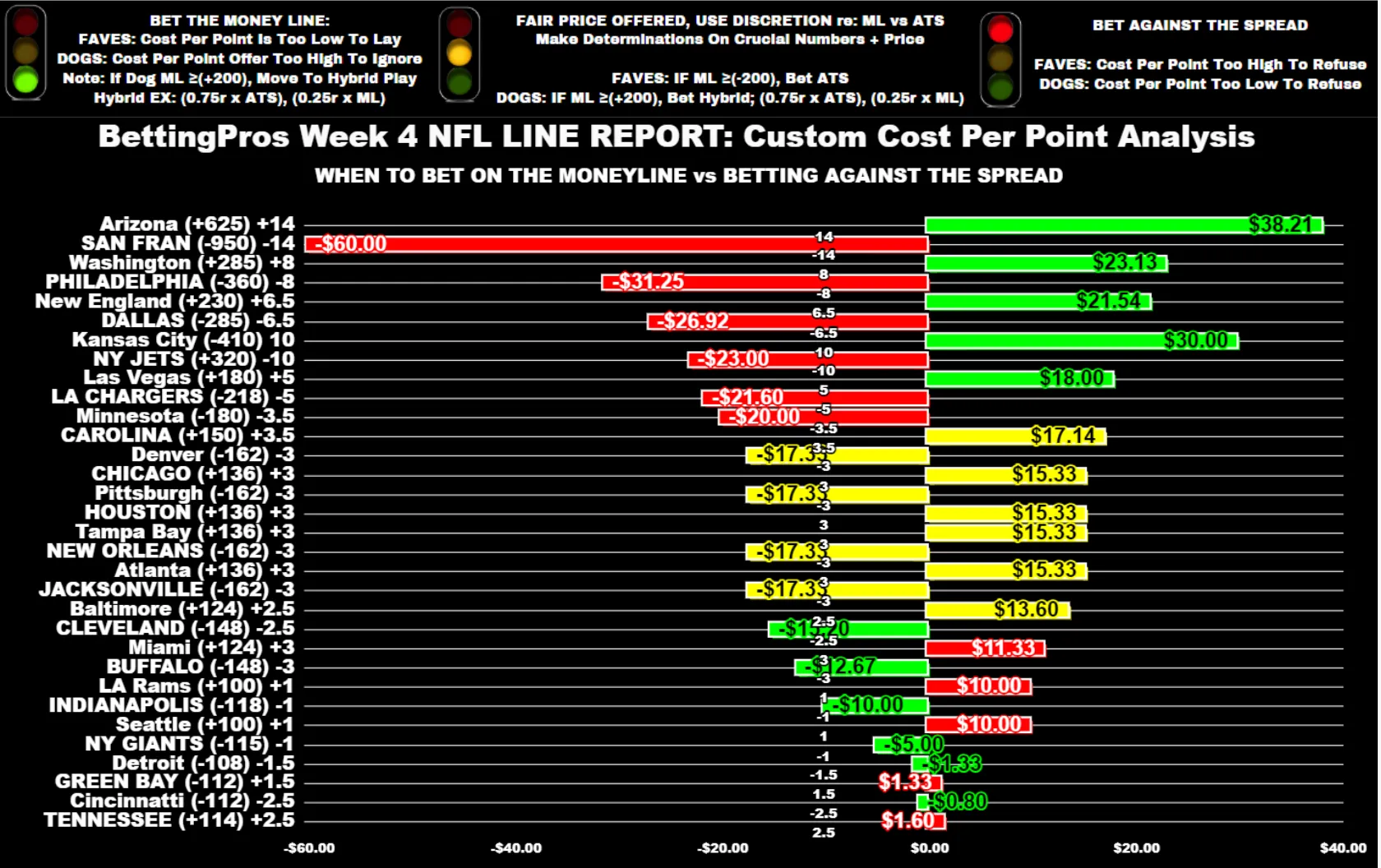 Welcome back to my Week 4 NFL Line Report at BettingPros, featuring my custom cost-per-point betting analysis. If you're unfamiliar with the concept, I encourage you to check out my Week 1 introduction. Long story short, NFL prices aren't standardized, so not all points are priced equally. I'm going to run valuations on the DraftKings betting board each week and chart prices to identify which scenarios are advantageous to bet the ML versus ATS (and vice-versa).