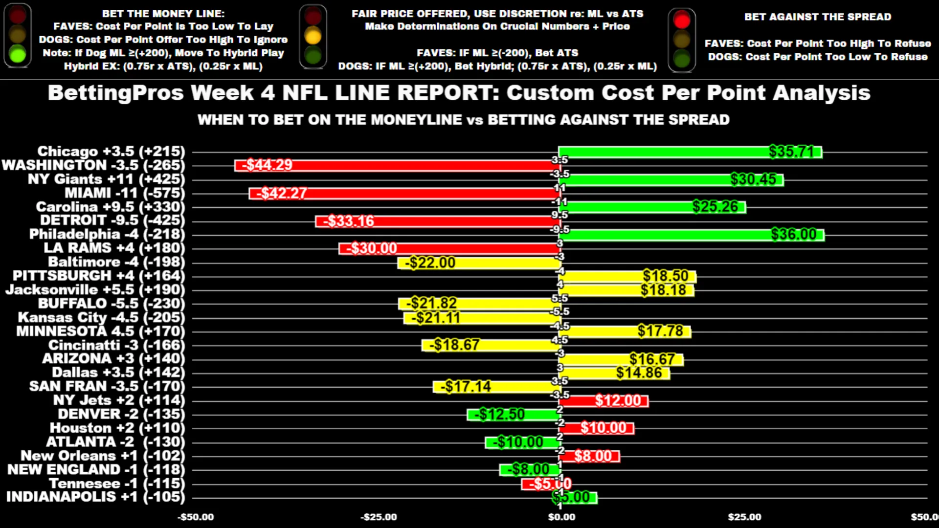 Welcome back to my Week 5 NFL Line Report at BettingPros, featuring my custom cost-per-point betting analysis. If you're unfamiliar with the concept, I encourage you to check out my Week 1 introduction. Long story short, NFL prices aren't standardized, so not all points are priced equally. I'm going to run valuations on the DraftKings Sportsbook betting board each week and chart prices to identify which scenarios are advantageous to bet the ML versus ATS (and vice-versa).