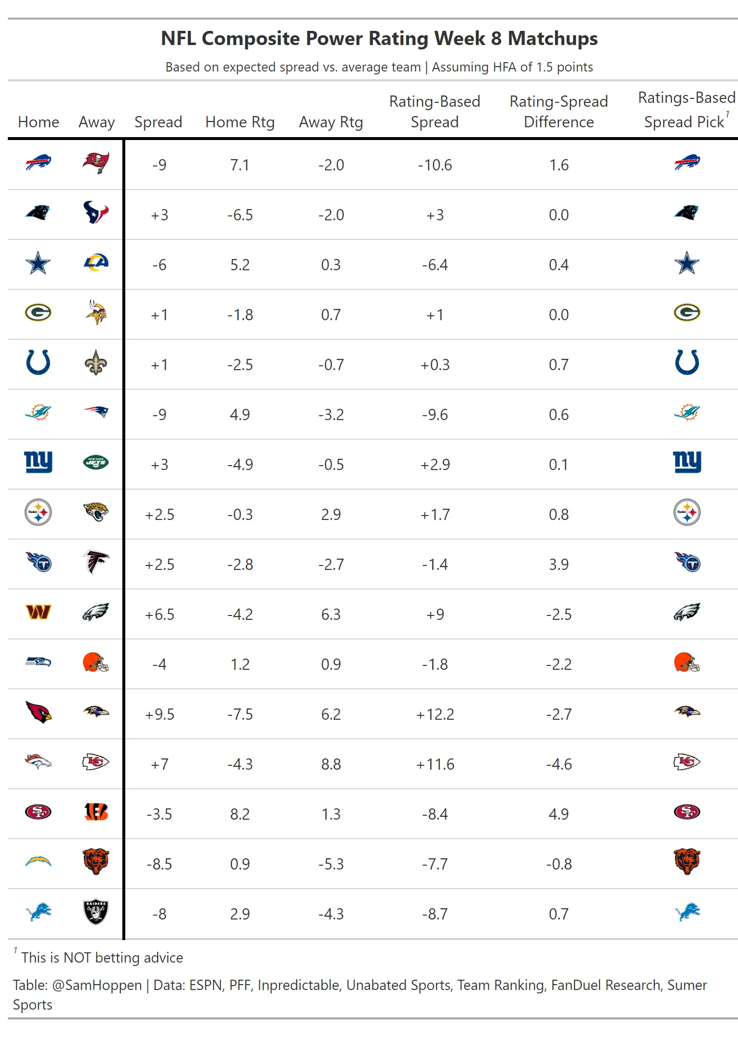 - It’s very important to keep in mind that these ratings do not account for injuries (specifically quarterback injuries). That is the primary reason why you’re seeing such massive differences in the ratings-based spreads for the 49ers vs. Bengals and Titans vs. Falcons matchups as both Brock Purdy (concussion) and Ryan Tannehill (ankle) are not expected to play for their teams this Sunday.