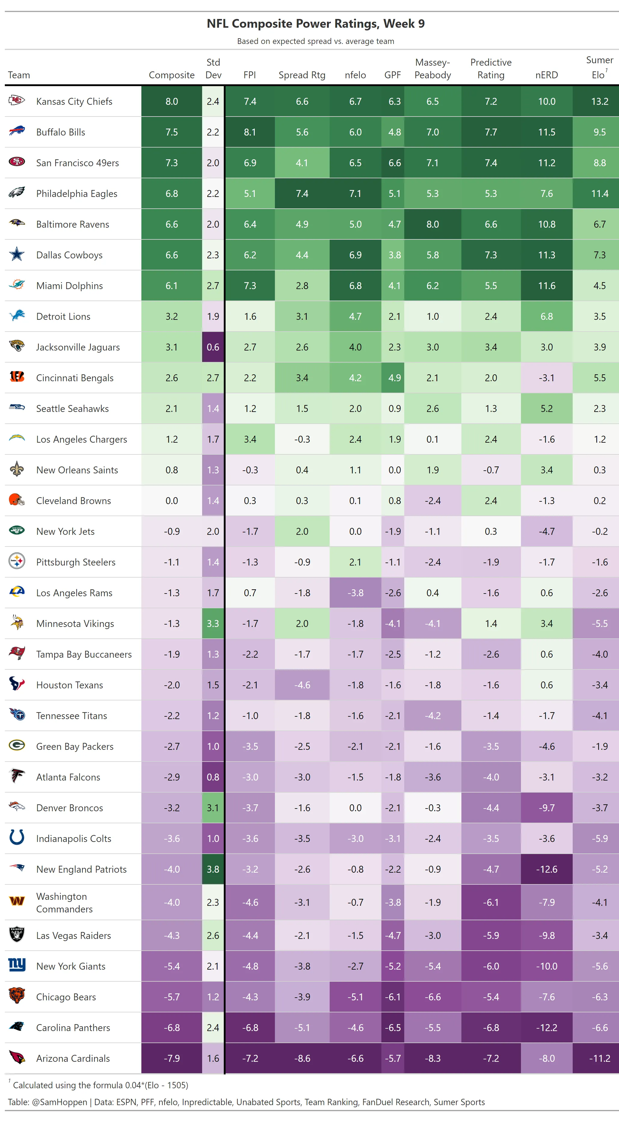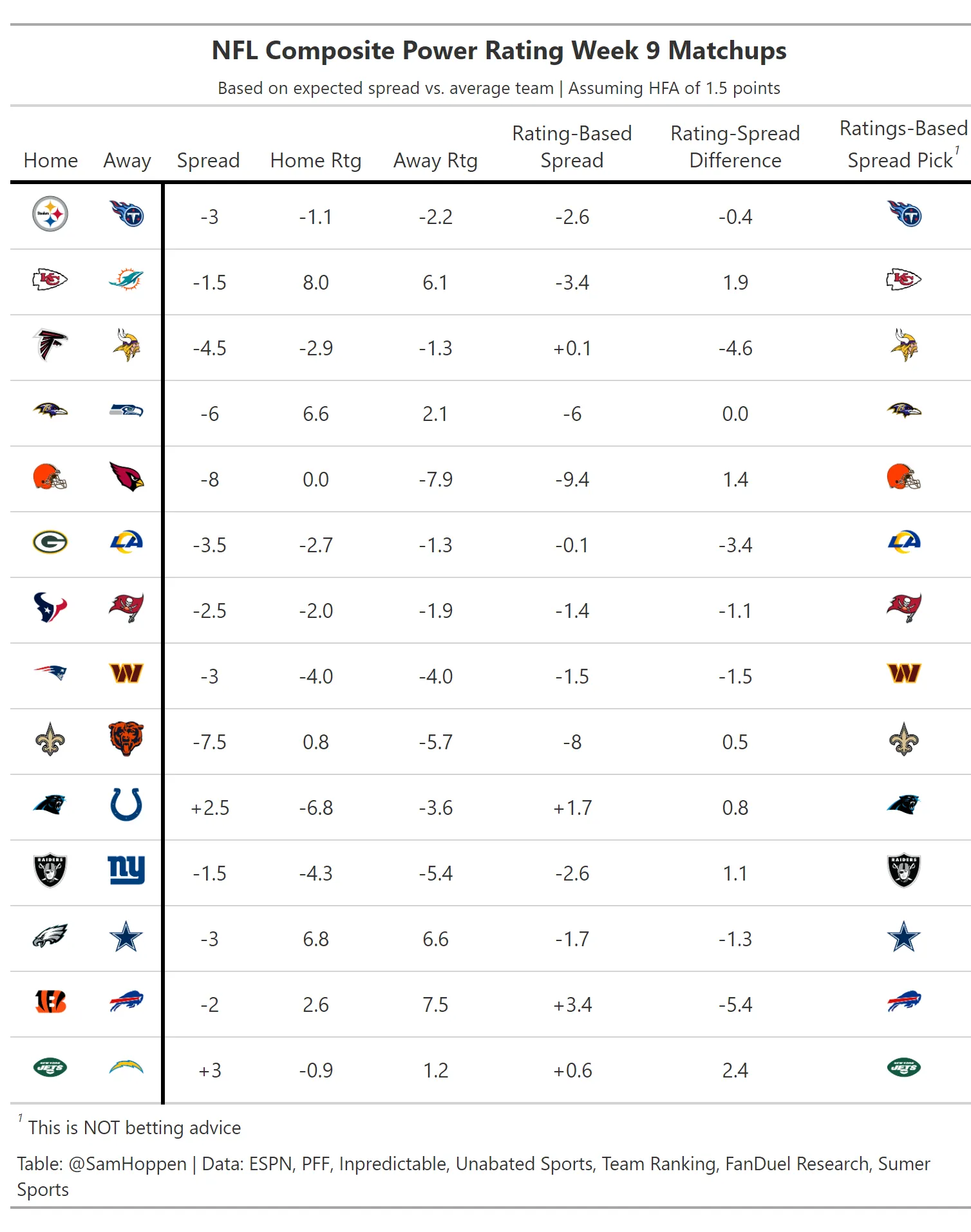 Each week, I compile power ratings from a bevy of respected sources across the NFL handicapping community. Power ratings are designed to identify how many points a team would be favored by against an average team on a neutral field. By calculating the difference in ratings between the two teams (and adjusting for home-field advantage), you can get a ratings-implied spread to compare to the actual spread. In the second section, I’ve done that while assuming a value of 1.5 points for home-field advantage and using the composite spread from all the sources. Additionally, I’ve provided some comments on trends and numbers that stood out to me.