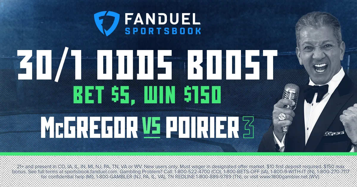 The great offers from FanDuel Sportsbook continue, and another is ready for UFC 264. FanDuel Sportsbook is providing a chance for new users to turn $5 into $150. That’s right, FanDuel Sportsbook is offering 30/1 odds on either fighter, Conor McGregor vs Dustin Poirier, in the main event!