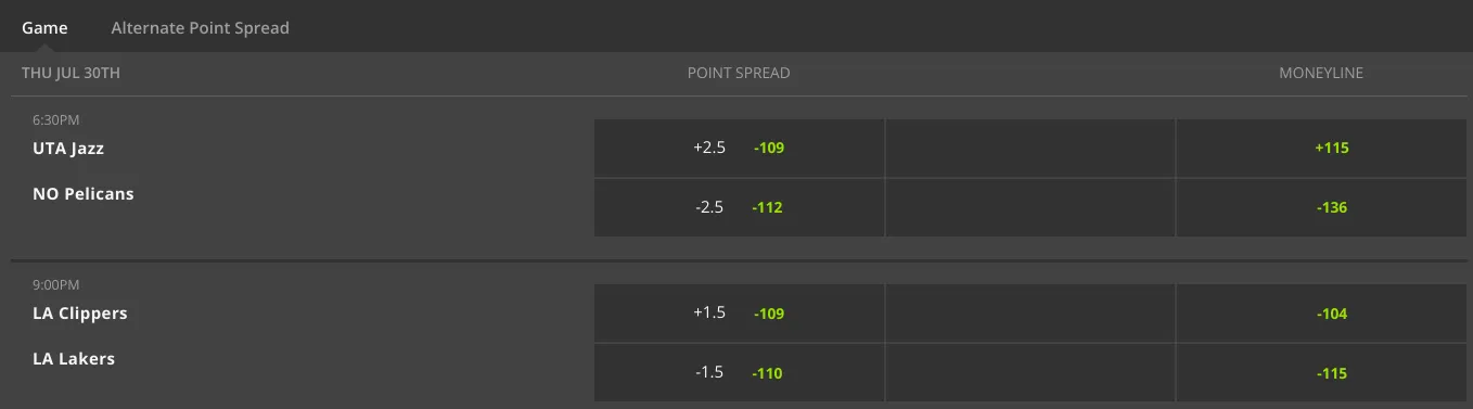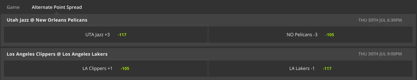 DraftKings Sportsbook has already posted lines for the first set of NBA games in Orlando. DraftKings is also one of the few sportsbooks offering alternate spreads at the moment. Here is a side-by-side graphic of the game spread and alternate point spread for the first two games scheduled for July 30.