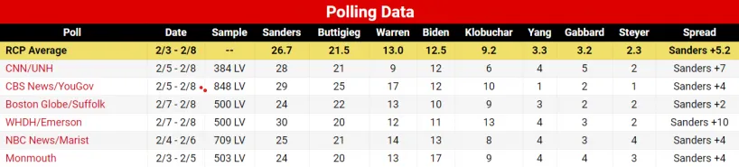 If this polling holds, which it should, given that New Hampshire is a traditional primary state, it’s a two-way race between Bernie Sanders and Pete Buttigieg. Sanders has the advantage, but there were signs of a late-breaking Buttigieg surge. The Boston Globe/Suffolk poll, for instance, puts the candidates just two points apart, and the same pollster had him one point ahead a day prior.