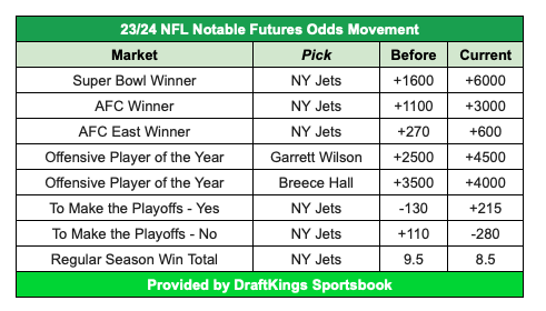 While it is important not to overreact to the results of Week 1, there were certainly a number of events that caused larger fluctuations in the market than might otherwise have happened. The New York Jets suffered a significant decrease due to the season-ending injury of QB Aaron Rodgers. While they opened at +2800 odds, they were at +1800 heading into their Monday Night Game and slid to +6600 following it.