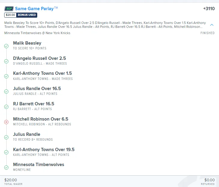 Malik Beasley scored ten points exactly. D’Angelo Russell hit four threes. Karl-Anthony Towns had two made threes and twenty points total. Julius Randle scored 21 points and nine rebounds. RJ Barrett scored 17 points. AND the Timberwolves won. But the bet lost because Mitch Robinson had six rebounds. In watching the game, there was one rebound that Mitch caught the rebound, planted both feet on the ground then stepped out on his pivot, which was ruled as a Timberwolves team rebound, rather than a rebound and a turnover which would have made this parlay cash.