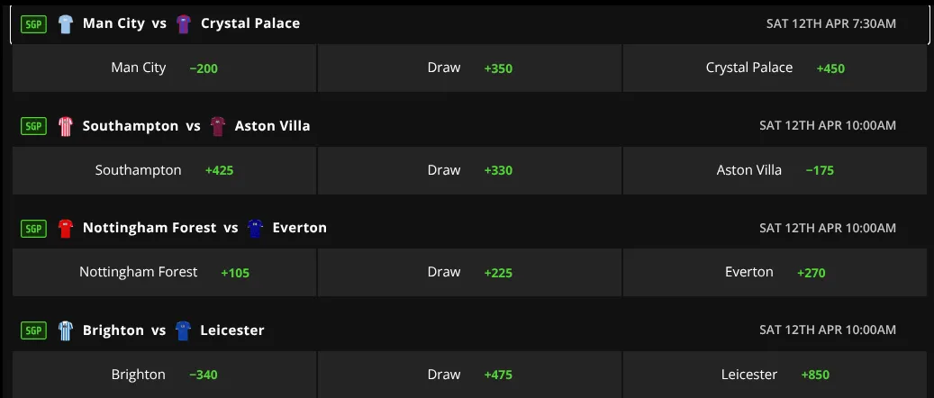 Below is a screenshot of the same English Premier League matches as above, but involves only the “Draw No Bet” odds.