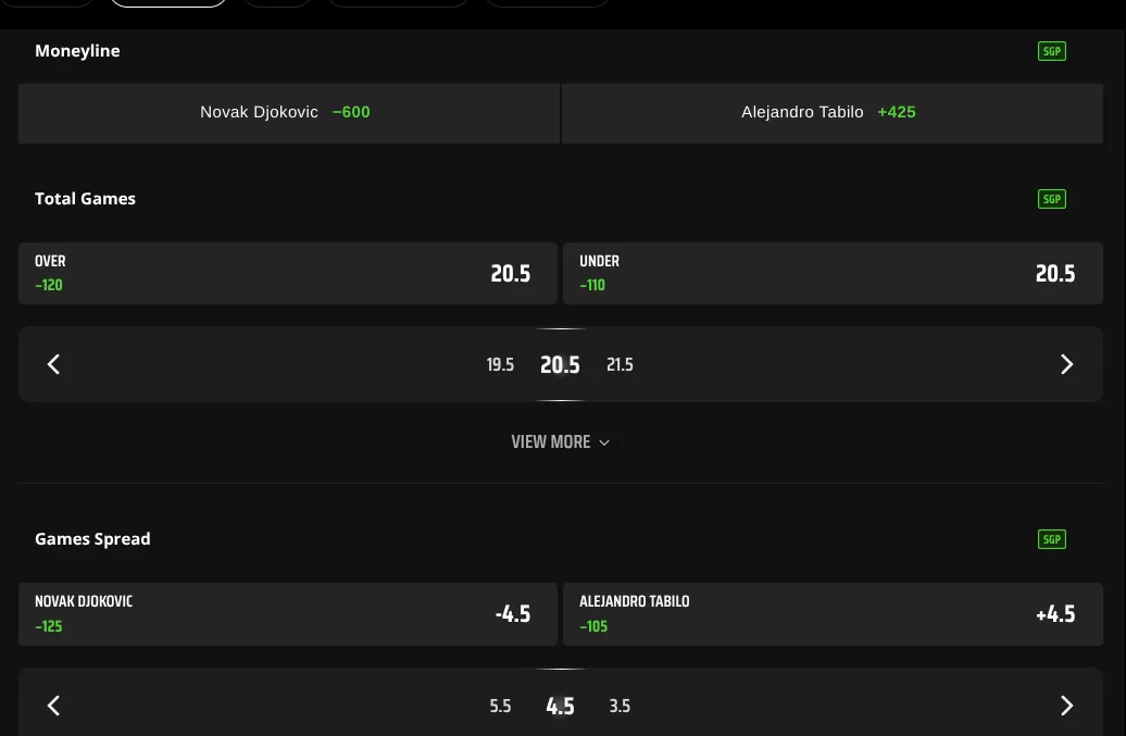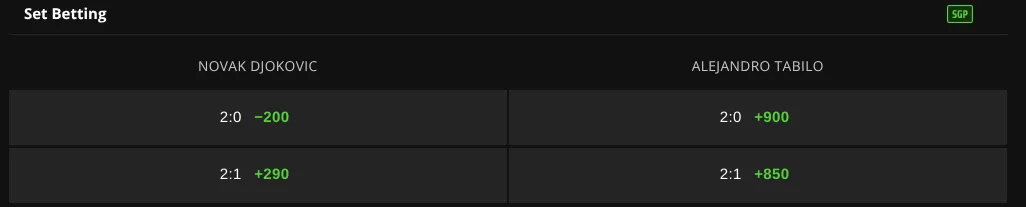 Below is a graphic of pre-match odds between Novak Djokovic and Alejandro Tabilo. Note the moneyline odds available for both players, where one would simply be betting on a player to win the match outright.